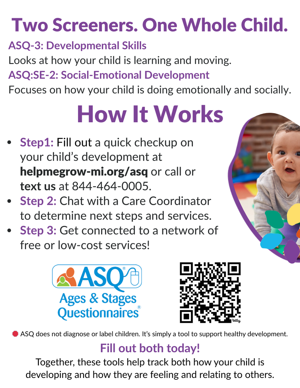 Step 1: Complete a quick online checkup at helpmegrow-mi.org/asq or call or text 844-464-0005.